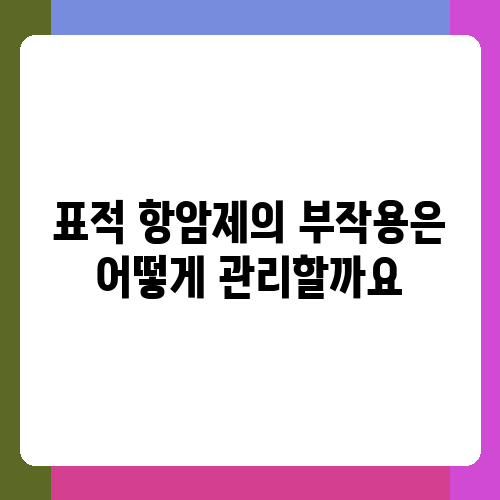 표적 항암제는 기존 항암 화학요법에 비해 부작용이 적다고는 하지만, 피로, 메스꺼움, 구토, 설사, 탈모 등의 부작용이 나타날 수 있습니다. 특히, 각 표적 항암제마다 특징적인 부작용이 있을 수 있으므로, 치료 전에 의사로부터 자세한 설명을 듣고 부작용 관리 계획을 미리 세워두는 것이 중요합니다. 부작용이 나타나면 의사에게 즉시 알리고 적절한 조치를 받는 것이 중요합니다. 의료진과의 꾸준한 소통을 통해 부작용을 최소화하고 삶의 질을 유지하는데 집중하는 것이 중요하다고 생각합니다. 병원에서 제공하는 지원 프로그램이나 환자 지원 단체를 활용하는 것도 도움이 될 수 있습니다. 자신의 건강 상태를 주의 깊게 관찰하고 변화가 있다면 바로 의사에게 알리도록 해요.