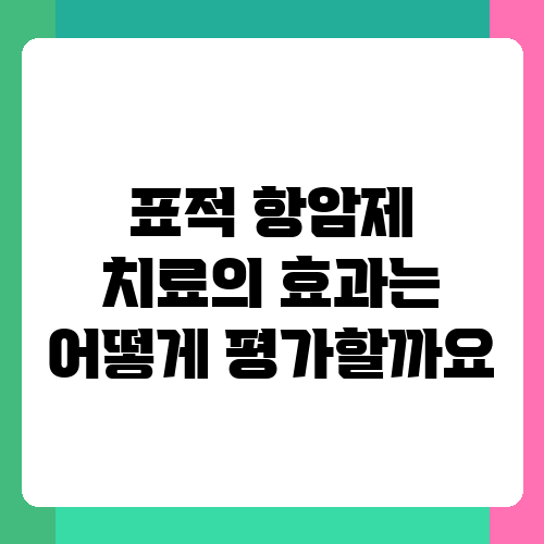 표적 항암제 치료의 효과는 여러 가지 방법으로 평가할 수 있습니다. 암의 크기가 줄어드는지, 암이 더 이상 진행되지 않는지, 생존 기간이 늘어나는지 등을 종합적으로 고려합니다. 이러한 평가는 영상 검사, 혈액 검사, 종양 표지자 검사 등을 통해 이루어집니다. 치료의 효과는 환자마다 다를 수 있고, 치료 과정에서 효과가 나타나는 시점도 다를 수 있습니다. 따라서, 꾸준히 치료를 받으면서 정기적인 검사를 통해 치료 효과를 모니터링하는 것이 중요합니다. 의료진과 꾸준히 소통하며 치료 계획을 조정하는 것도 잊지 마세요. 꾸준한 관리와 적극적인 참여가 치료 성공의 중요한 열쇠입니다.